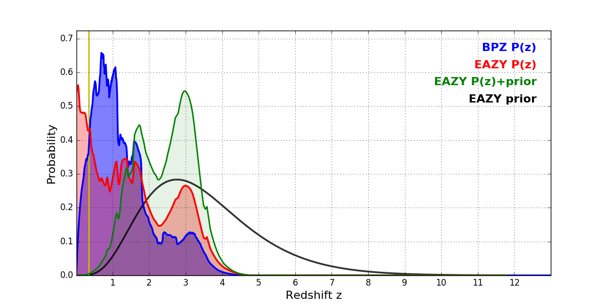 In P(z) plots: Yellow lines mark the cluster redshift z = 0.352,