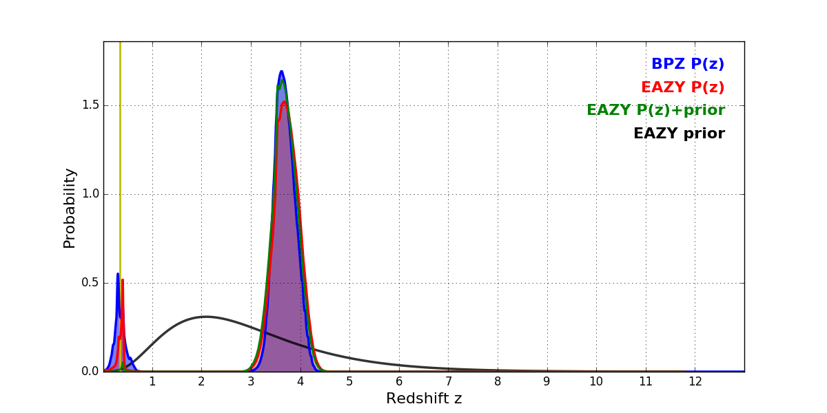 In P(z) plots: Yellow lines mark the cluster redshift z = 0.352,