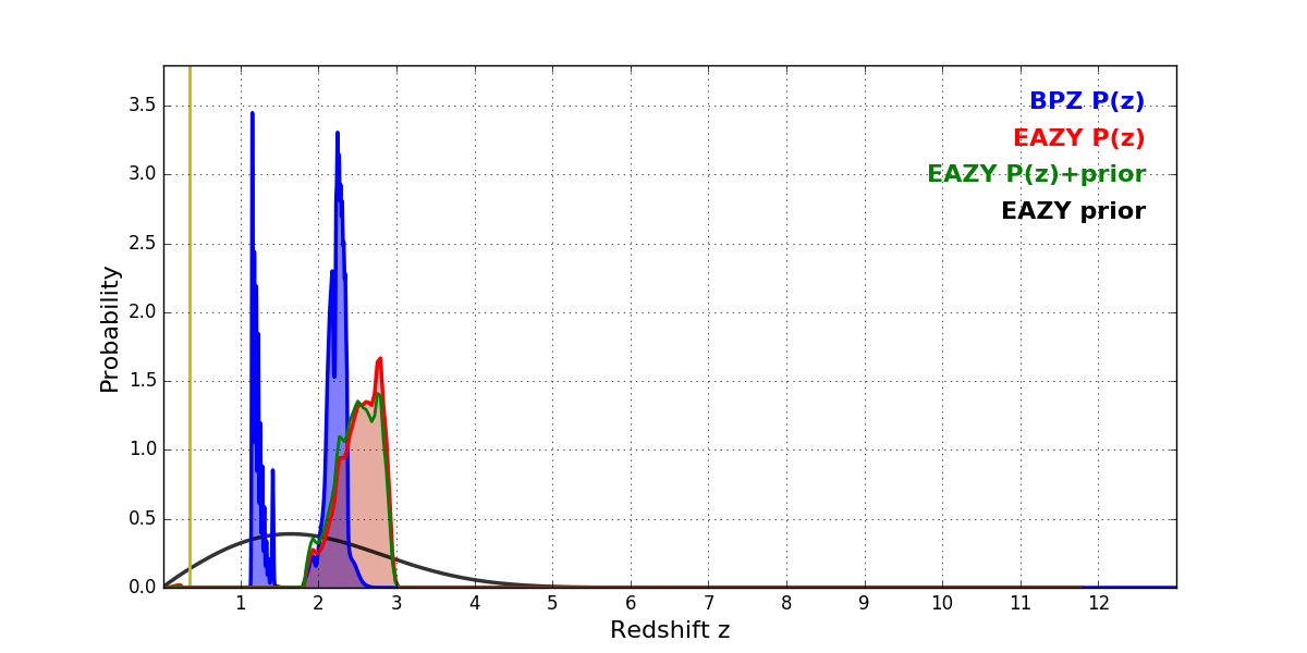 In P(z) plots: Yellow lines mark the cluster redshift z = 0.352,