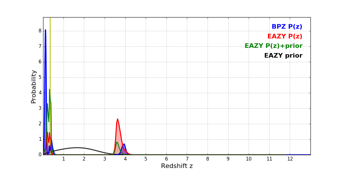 In P(z) plots: Yellow lines mark the cluster redshift z = 0.352,