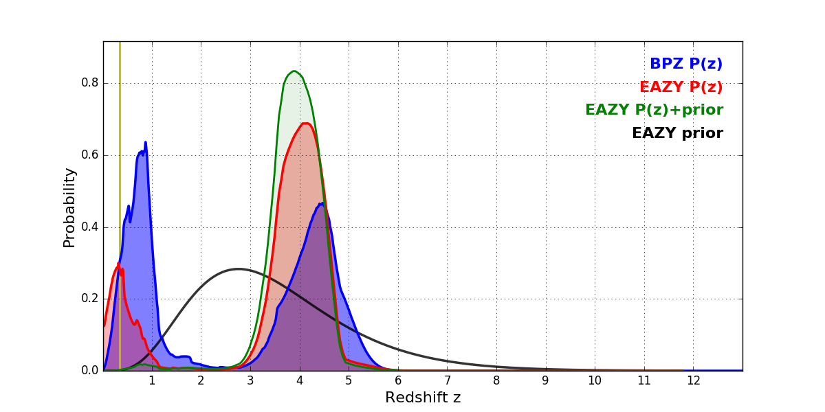In P(z) plots: Yellow lines mark the cluster redshift z = 0.352,
