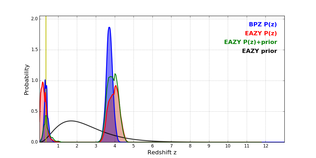 In P(z) plots: Yellow lines mark the cluster redshift z = 0.352,