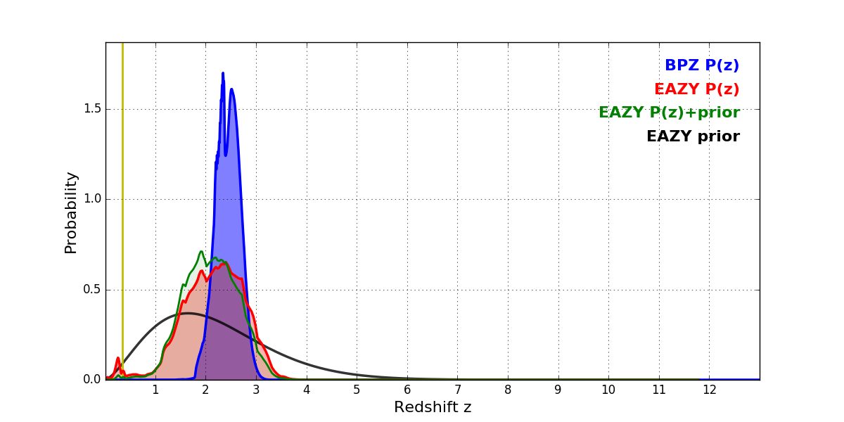 In P(z) plots: Yellow lines mark the cluster redshift z = 0.352,