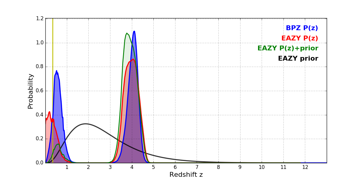 In P(z) plots: Yellow lines mark the cluster redshift z = 0.352,