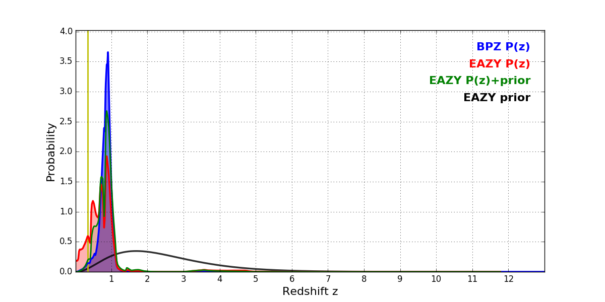In P(z) plots: Yellow lines mark the cluster redshift z = 0.352,