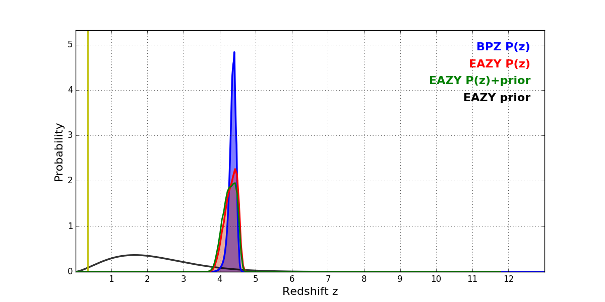 In P(z) plots: Yellow lines mark the cluster redshift z = 0.352,