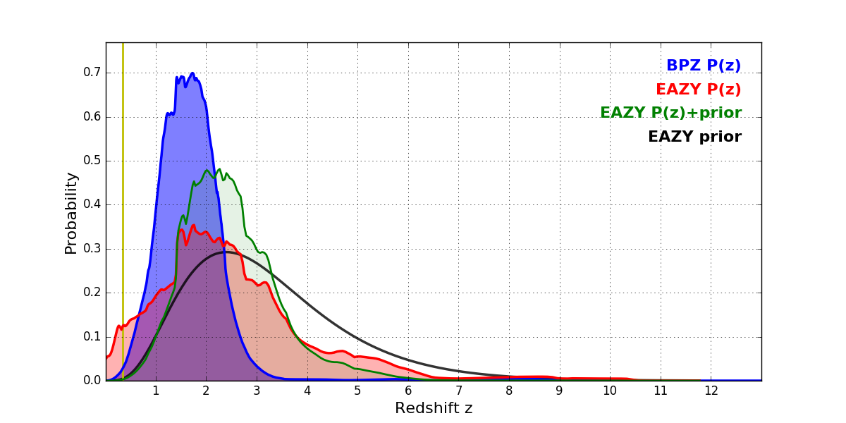 In P(z) plots: Yellow lines mark the cluster redshift z = 0.352,