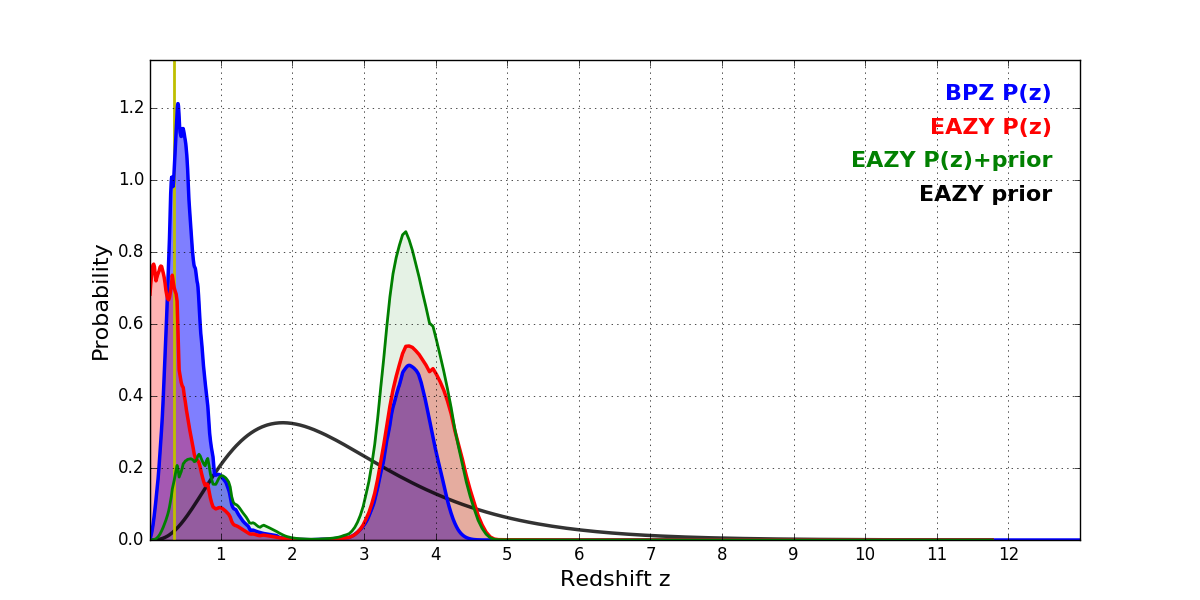 In P(z) plots: Yellow lines mark the cluster redshift z = 0.352,