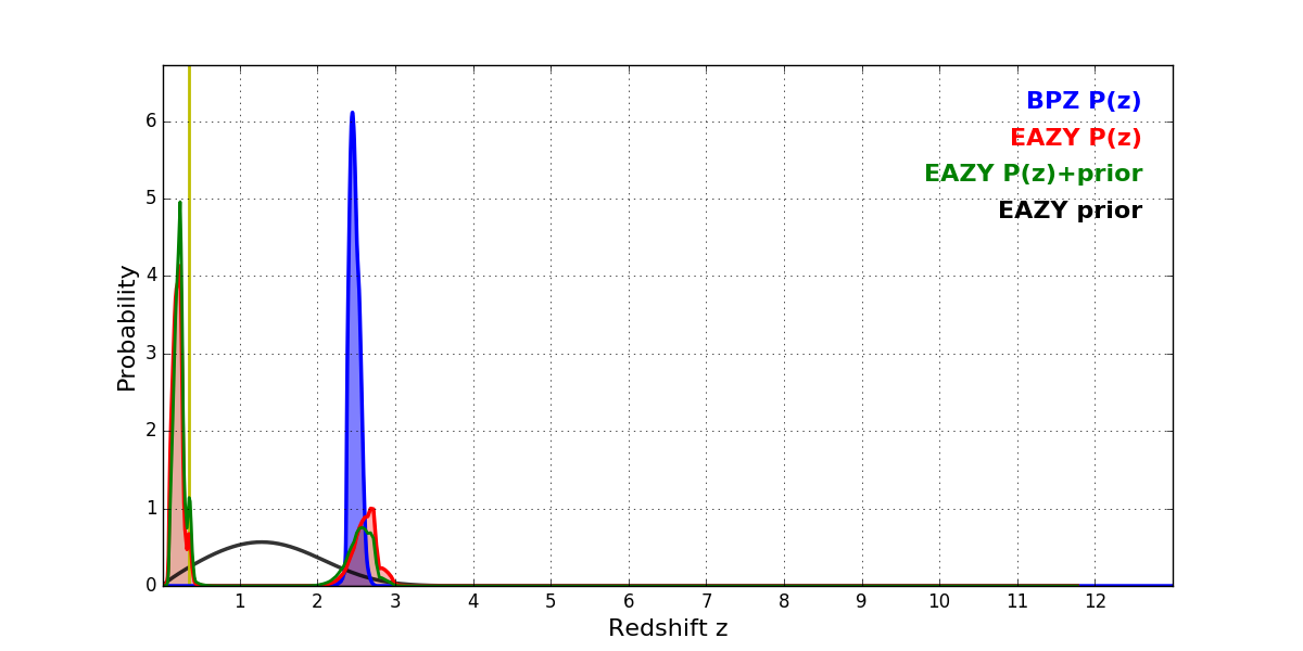 In P(z) plots: Yellow lines mark the cluster redshift z = 0.352,