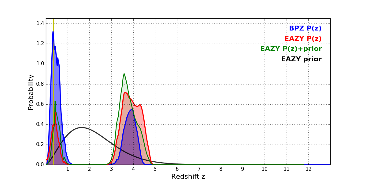 In P(z) plots: Yellow lines mark the cluster redshift z = 0.352,