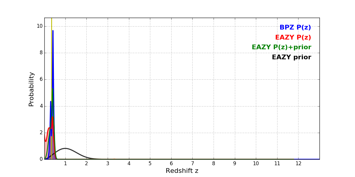 In P(z) plots: Yellow lines mark the cluster redshift z = 0.352,