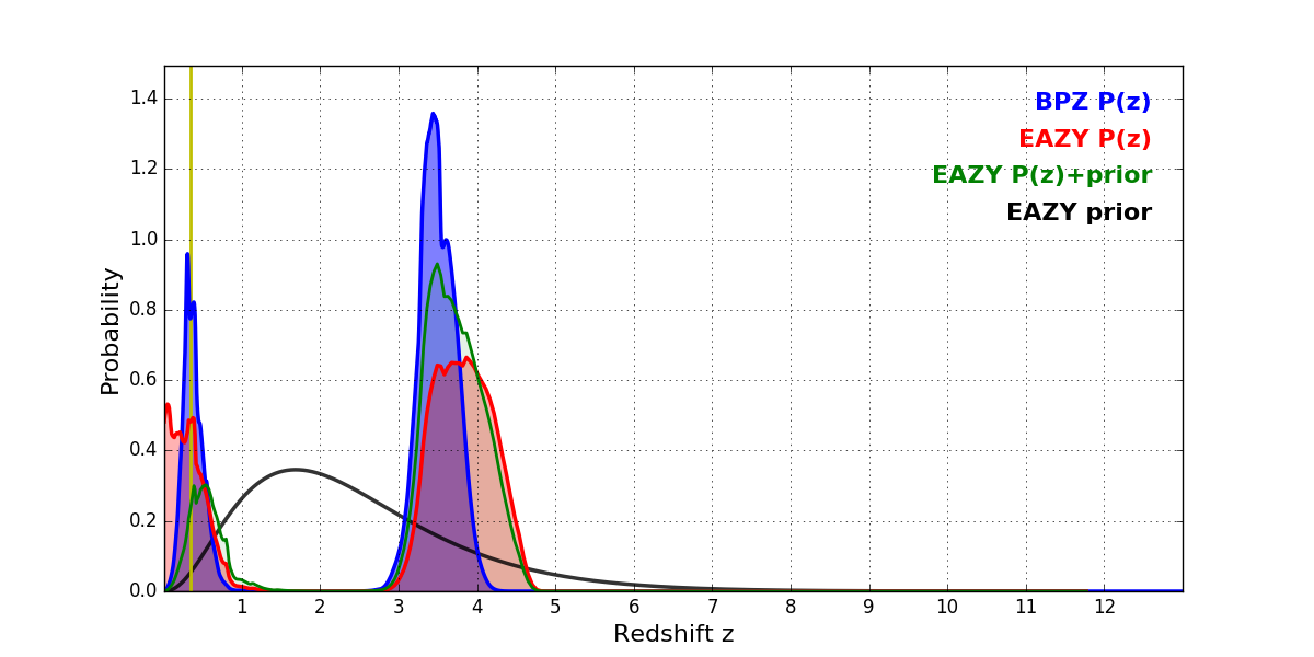 In P(z) plots: Yellow lines mark the cluster redshift z = 0.352,