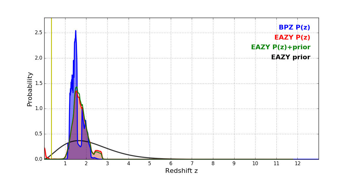 In P(z) plots: Yellow lines mark the cluster redshift z = 0.352,