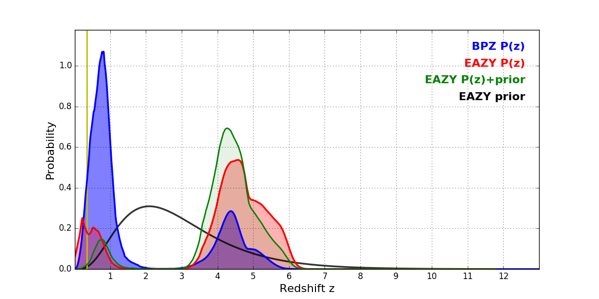 In P(z) plots: Yellow lines mark the cluster redshift z = 0.352,