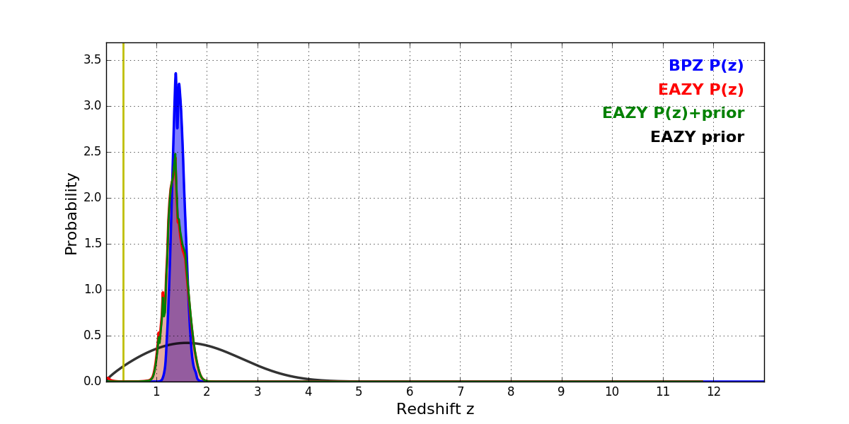 In P(z) plots: Yellow lines mark the cluster redshift z = 0.352,