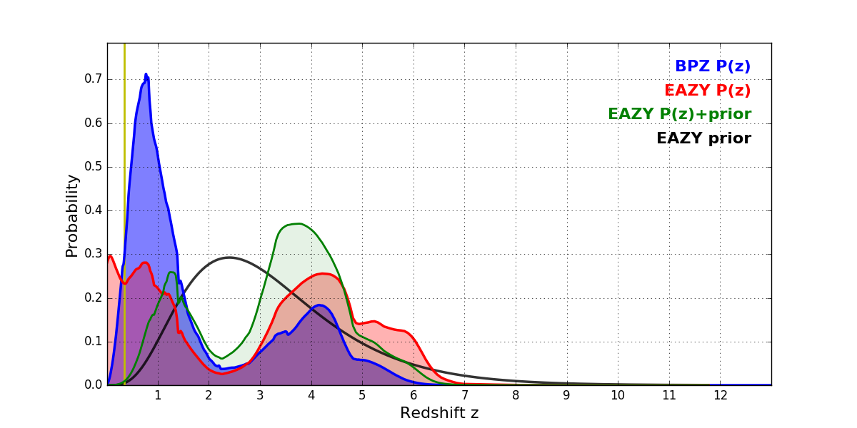 In P(z) plots: Yellow lines mark the cluster redshift z = 0.352,