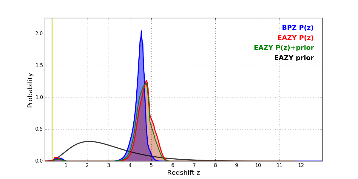 In P(z) plots: Yellow lines mark the cluster redshift z = 0.352,