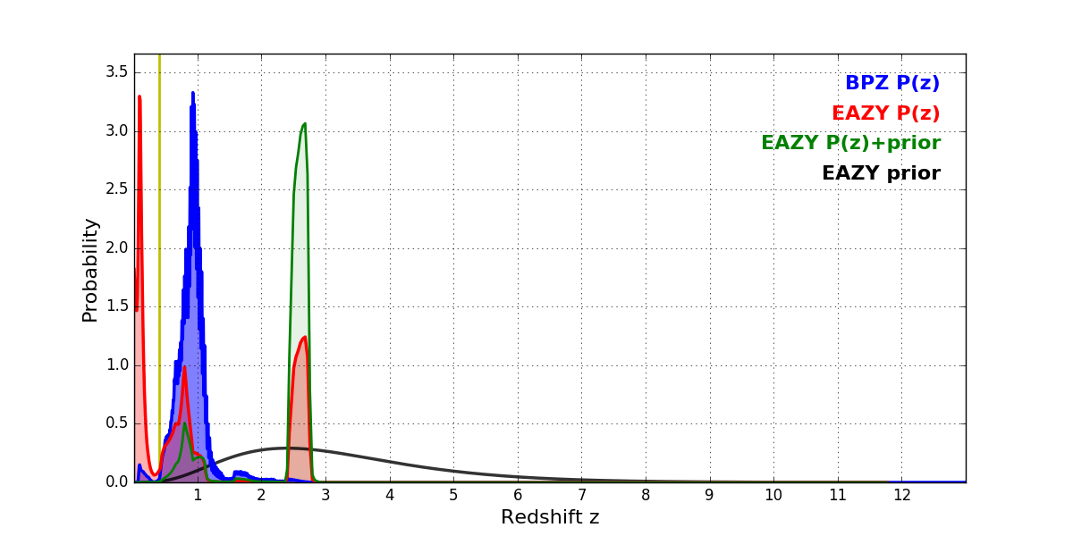 In P(z) plots: Yellow lines mark the cluster redshift z = 0.405,