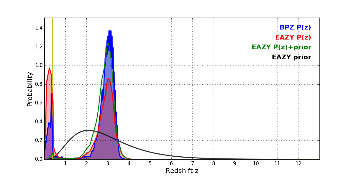 In P(z) plots: Yellow lines mark the cluster redshift z = 0.405,