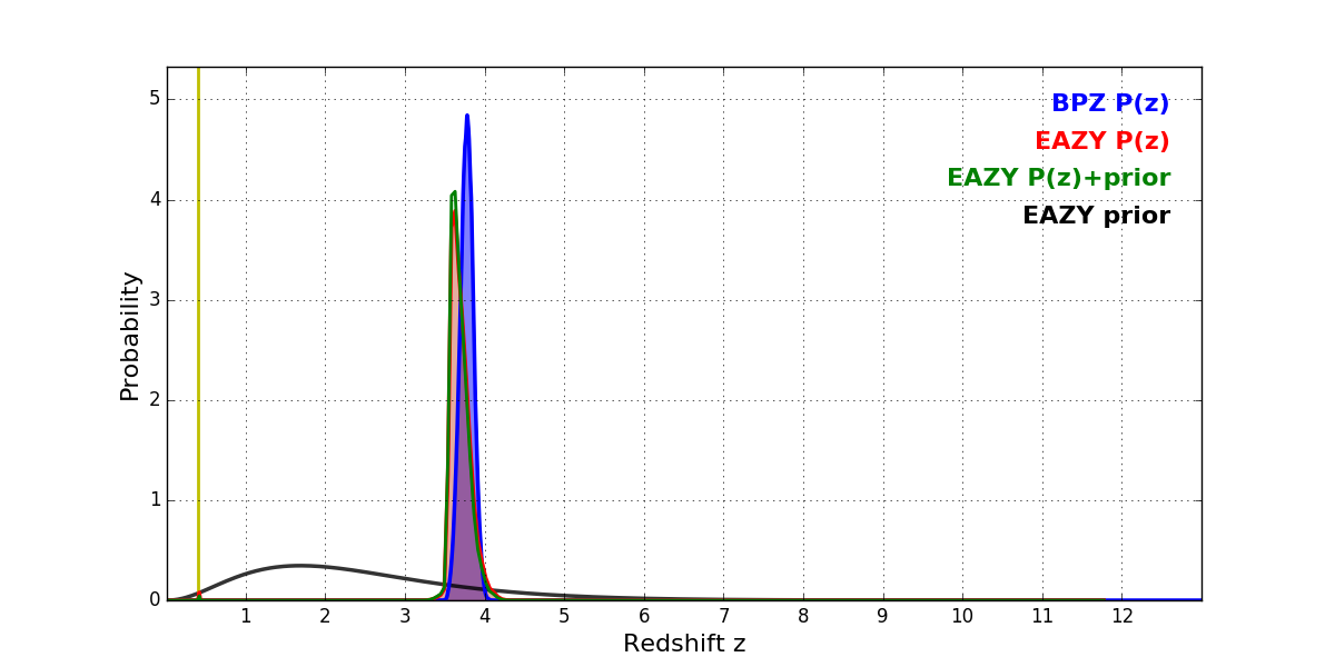 In P(z) plots: Yellow lines mark the cluster redshift z = 0.405,
