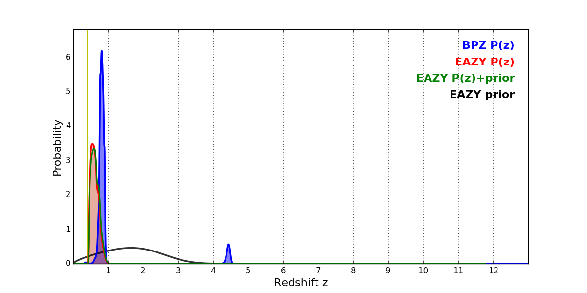 In P(z) plots: Yellow lines mark the cluster redshift z = 0.405,