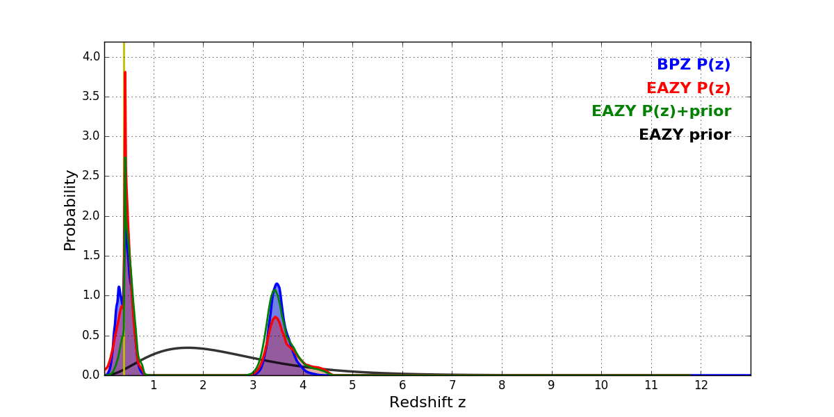In P(z) plots: Yellow lines mark the cluster redshift z = 0.405,