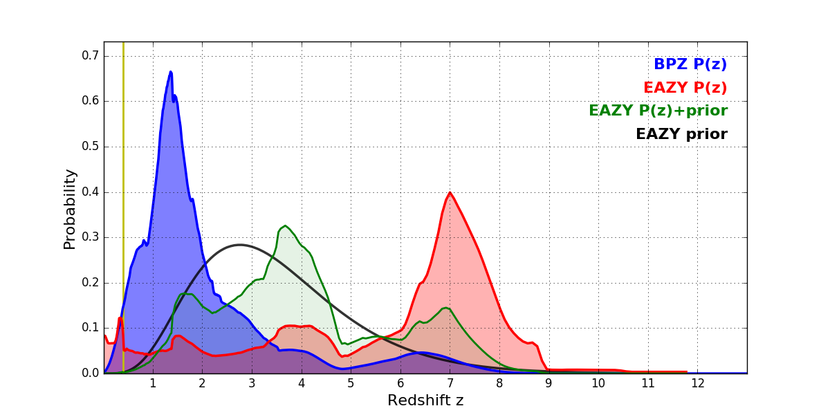 In P(z) plots: Yellow lines mark the cluster redshift z = 0.405,