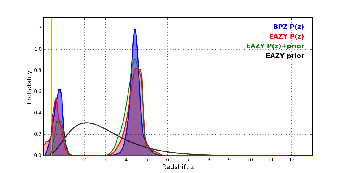 In P(z) plots: Yellow lines mark the cluster redshift z = 0.405,