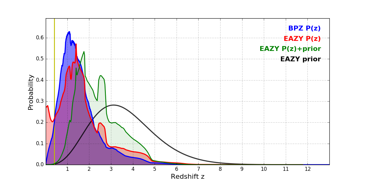 In P(z) plots: Yellow lines mark the cluster redshift z = 0.405,