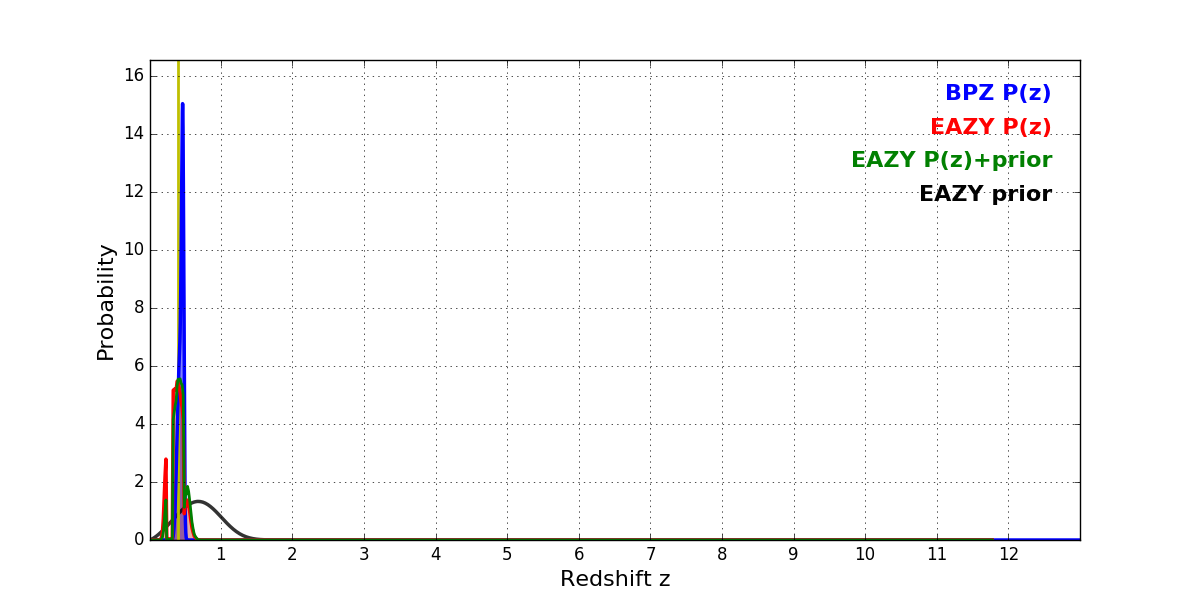 In P(z) plots: Yellow lines mark the cluster redshift z = 0.405,