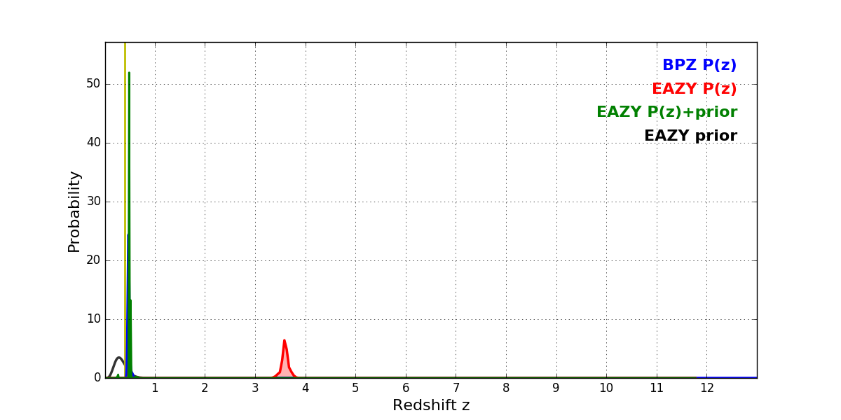 In P(z) plots: Yellow lines mark the cluster redshift z = 0.405,