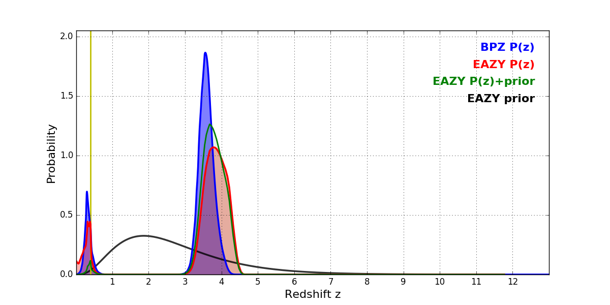 In P(z) plots: Yellow lines mark the cluster redshift z = 0.405,