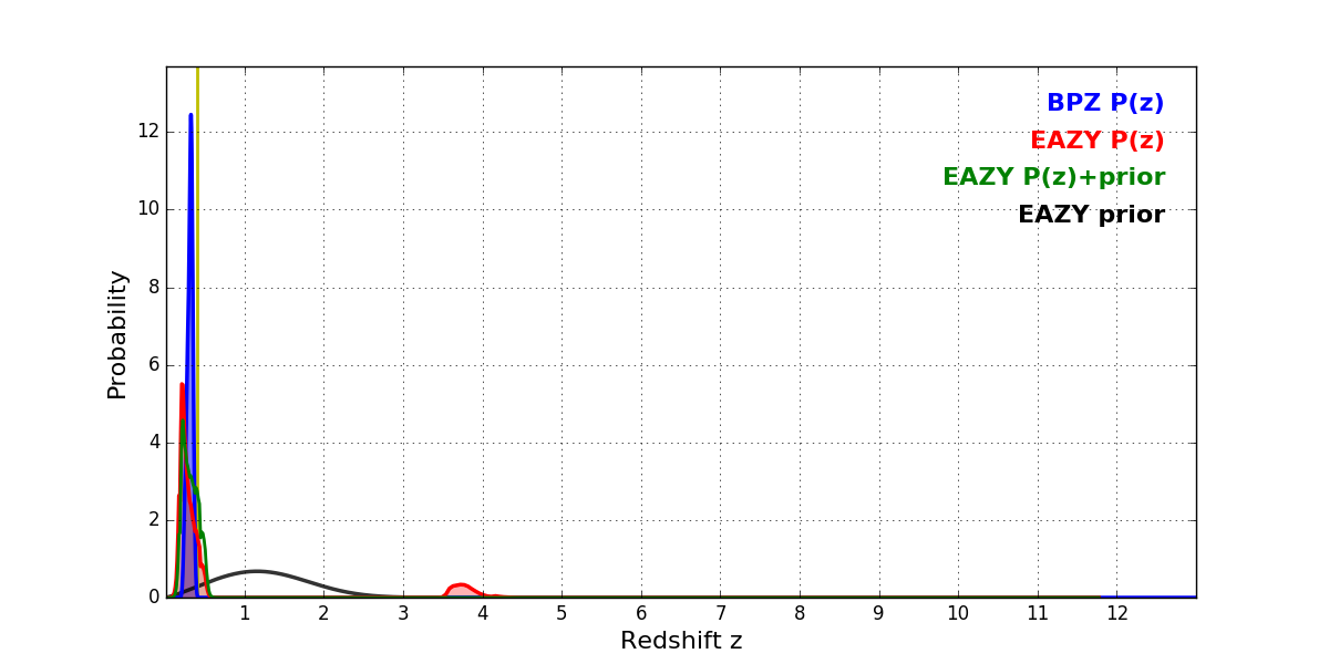 In P(z) plots: Yellow lines mark the cluster redshift z = 0.405,