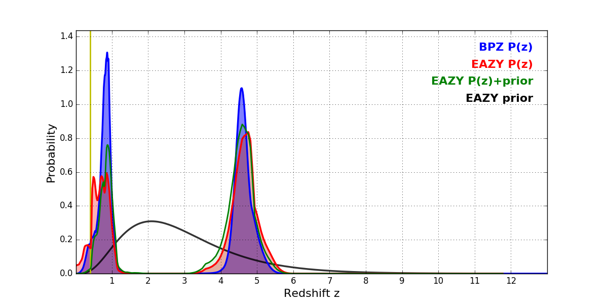 In P(z) plots: Yellow lines mark the cluster redshift z = 0.405,