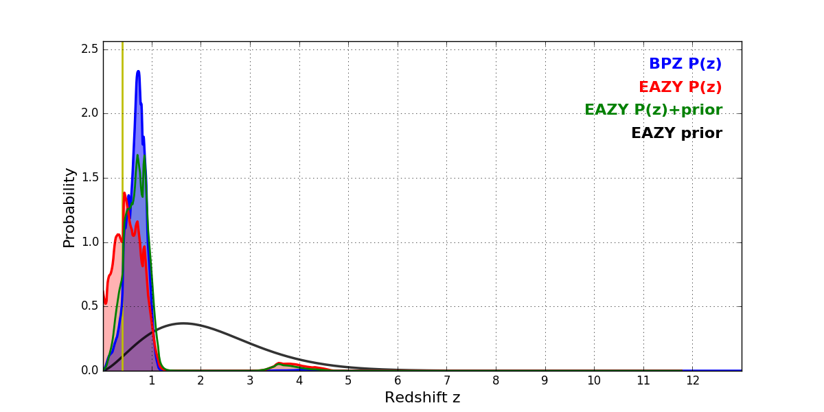In P(z) plots: Yellow lines mark the cluster redshift z = 0.405,