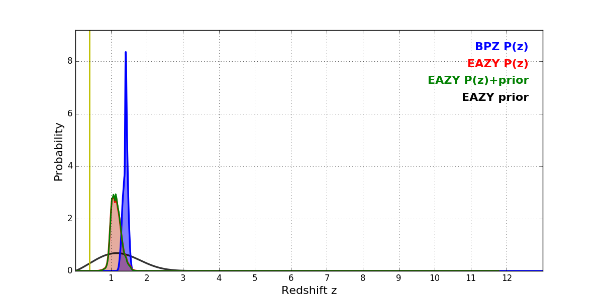 In P(z) plots: Yellow lines mark the cluster redshift z = 0.405,