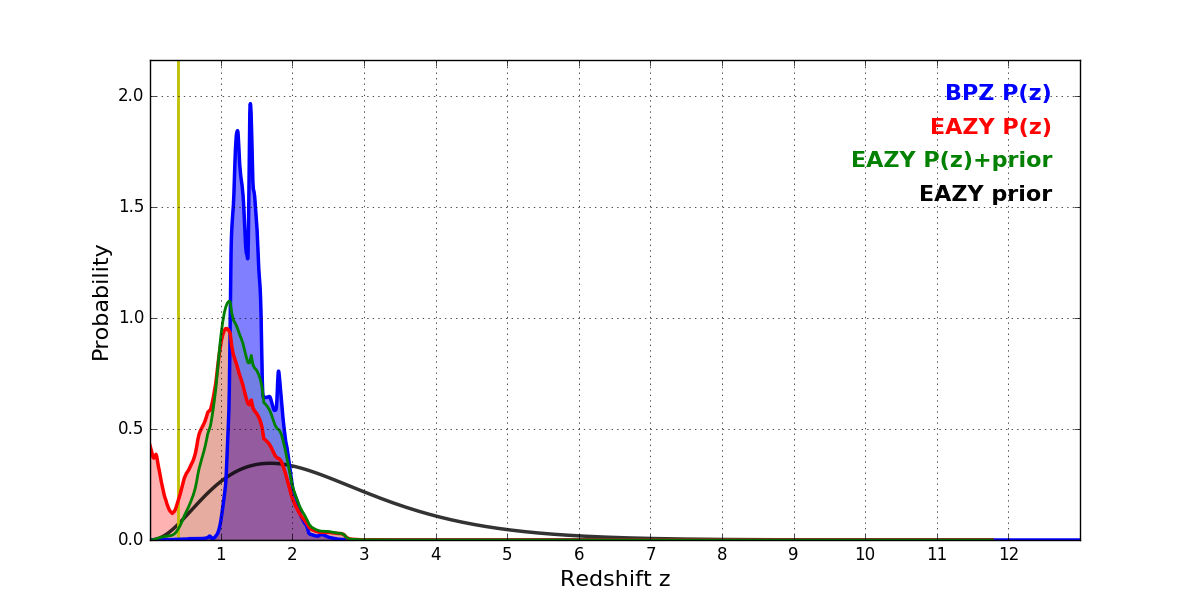 In P(z) plots: Yellow lines mark the cluster redshift z = 0.405,