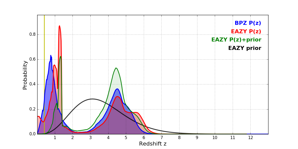 In P(z) plots: Yellow lines mark the cluster redshift z = 0.405,