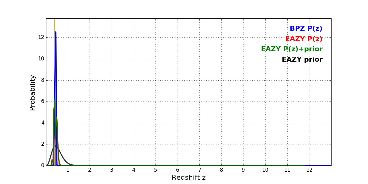 In P(z) plots: Yellow lines mark the cluster redshift z = 0.405,