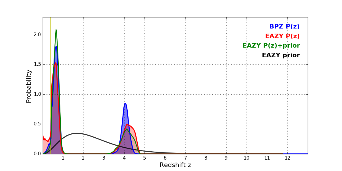 In P(z) plots: Yellow lines mark the cluster redshift z = 0.405,