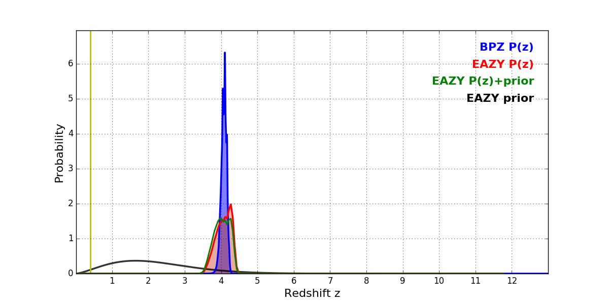 In P(z) plots: Yellow lines mark the cluster redshift z = 0.405,