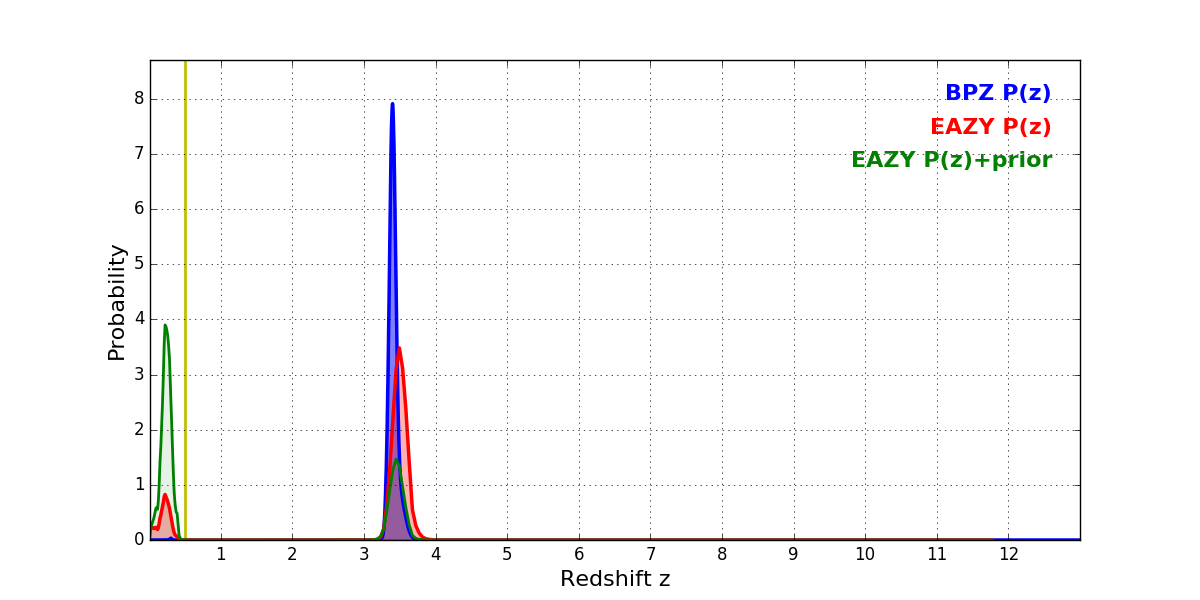 In P(z) plots: Yellow lines mark the cluster redshift z = 0.505,
