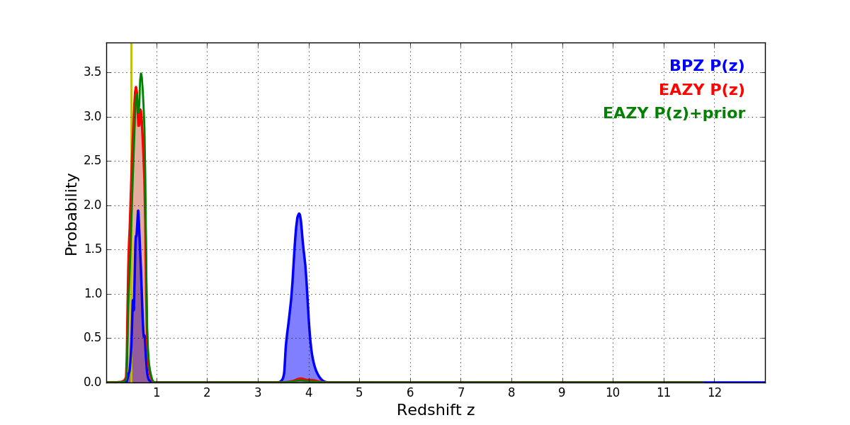 In P(z) plots: Yellow lines mark the cluster redshift z = 0.505,