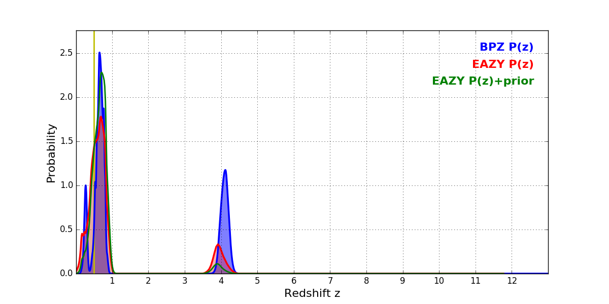 In P(z) plots: Yellow lines mark the cluster redshift z = 0.505,