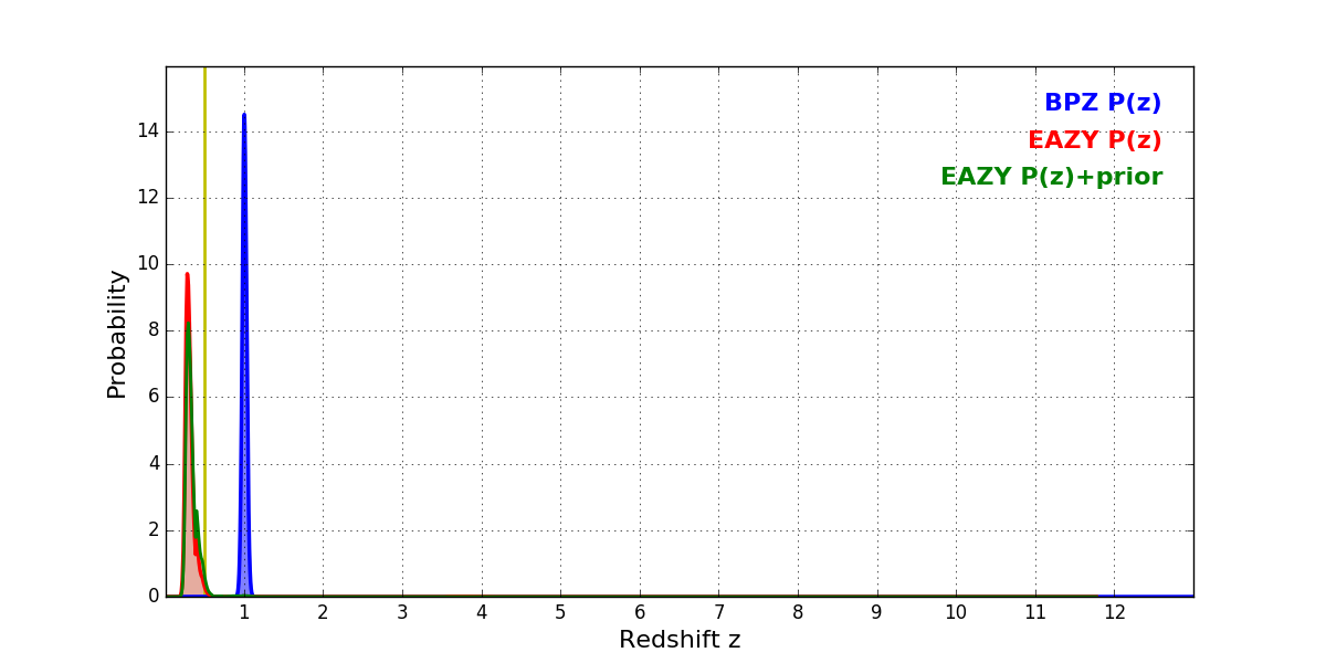 In P(z) plots: Yellow lines mark the cluster redshift z = 0.505,