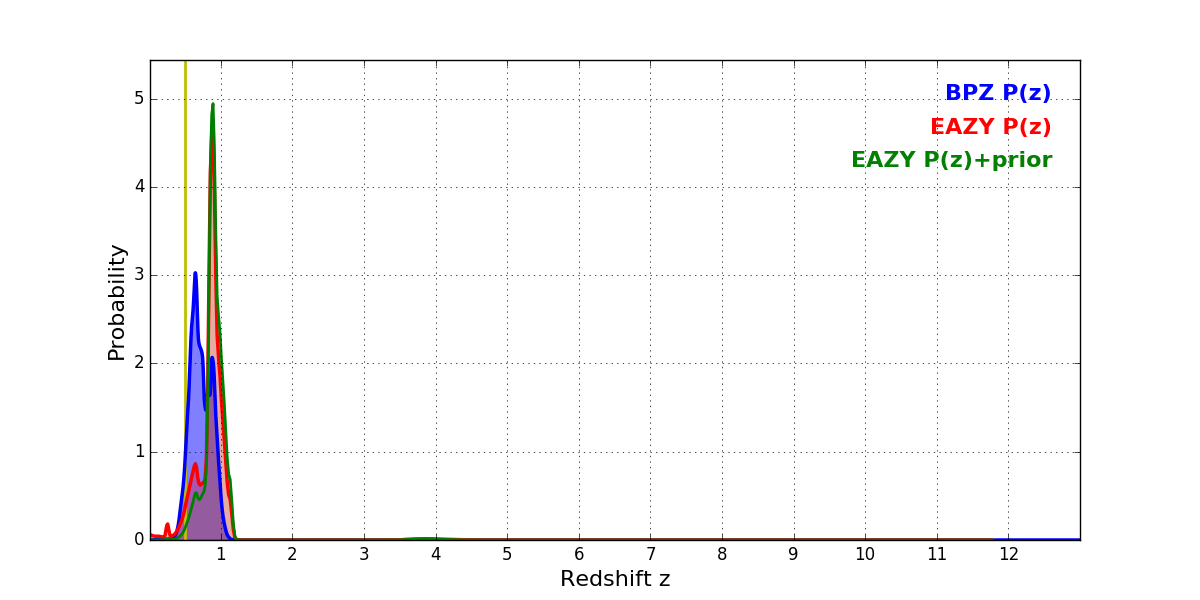 In P(z) plots: Yellow lines mark the cluster redshift z = 0.505,