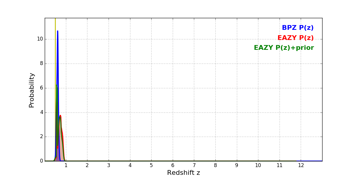 In P(z) plots: Yellow lines mark the cluster redshift z = 0.505,
