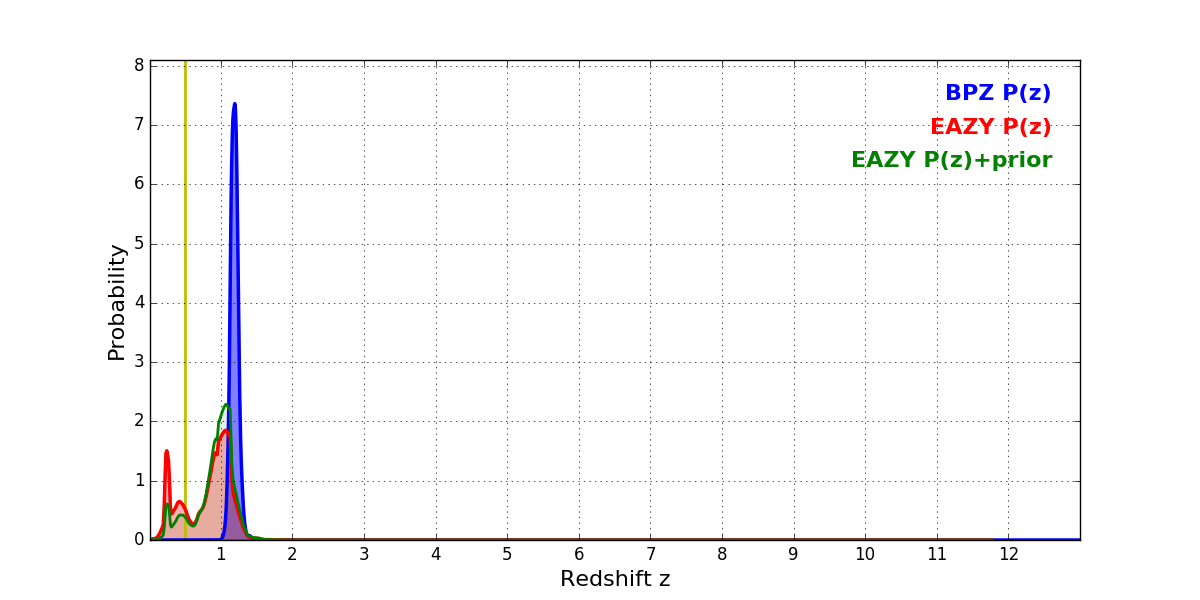 In P(z) plots: Yellow lines mark the cluster redshift z = 0.505,