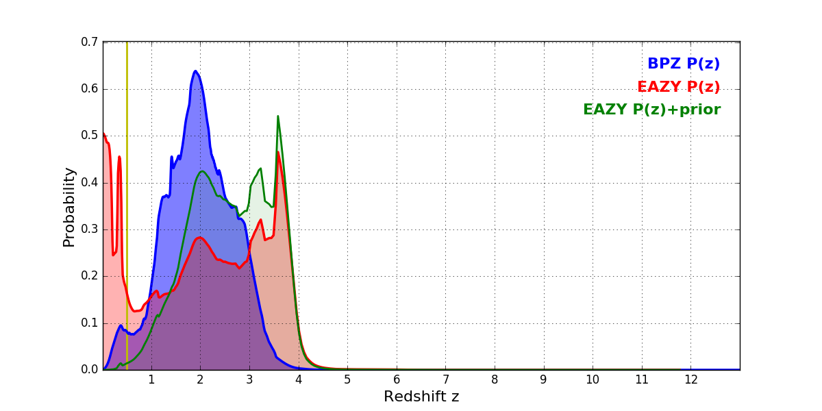In P(z) plots: Yellow lines mark the cluster redshift z = 0.505,