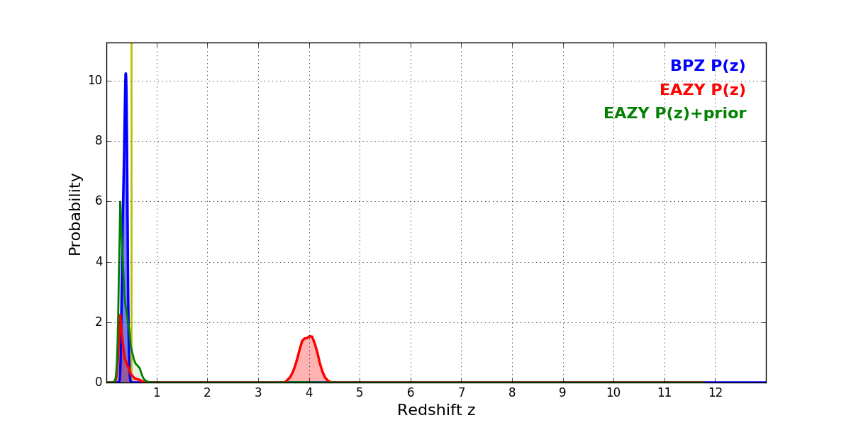 In P(z) plots: Yellow lines mark the cluster redshift z = 0.505,